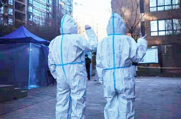 其實志愿工作并不難,主要是在核酸檢測時負責掃碼,或是配合醫護人員進行消殺。但恰恰是這些簡單的工作卻容不得一點疏漏。防護服是我們重要的防護物資,為節約資源,一旦穿上防護服就不能隨便脫下來,不能吃喝,手腳在寒風中凍得冰涼僵硬,但是總有一股子強烈的責任感和使命感支撐著我,使我在志愿者工作的道路上步伐堅定。